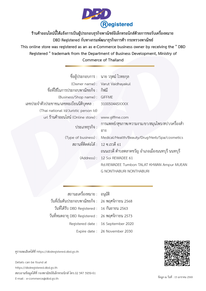 - ผลิตภัณฑ์กิฟฟารีนรับประกันคุณภาพ หากใช้แล้วไม่ตรงตามที่โฆษณา หรือพบปัญหาจากการใช้ สามารถเปลี่ยนหรือคืนได้